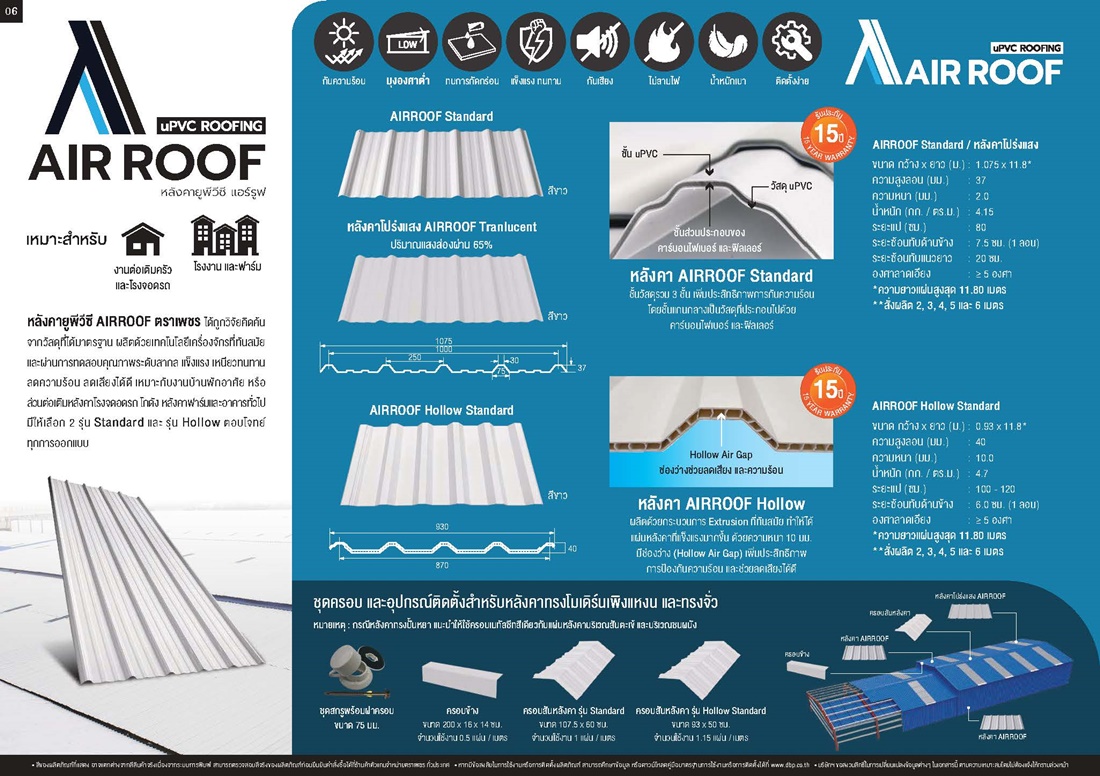 - กลุ่มหลังคา อาทิ หลังคายูพีวีซี แอร์รูฟ ลดเสียงรบกวนจากฝนตกกระทบ ทั้งรุ่น Standard และ รุ่น Hollow, กระเบื้องจตุลอนและลอนคู่ วินเทอร์ไวท์ ที่มาพร้อมกับเทคโนโลยีสะท้อนความร้อน TSR สูงถึง 90%, หลังคาเหล็กเคลือบผิวด้วยหินธรรมชาติ Diamond Stone Coated ลดความร้อนและลดเสียงรบกวนได้ถึง 13 เดซิเบล, ฉนวนกันความร้อน แอร์คูล ความหนา 3 และ 8 มิลลิเมตร สะท้อนความร้อนได้ 95%, ฉนวนใยแก้ว Very Cool ความหนา 2 และ 3 นิ้ว ช่วยลดความร้อนจากใต้หลังคาเข้าสู่บ้าน และได้รับฉลากประหยัดพลังงาน และฝ้าระบายอากาศ ช่วยเพิ่มการระบายอากาศร้อนบริเวณใต้หลังคา ช่วยให้บ้านเย็นขึ้น