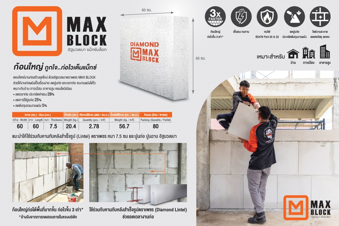 - กลุ่มผนัง อาทิ อิฐมวลเบา G2 สำหรับบ้านและทาวน์โฮม และอิฐมวลเบา G4 สำหรับคอนโดมิเนียมและอาคารสูง ผ่านมาตรฐาน มอก. 1505-2541 ความหนา 7.5 – 20 เซนติเมตร ช่วยป้องกันความร้อนเข้าสู่ภายในอาคารได้ดีกว่าอิฐมอญ รวมถึงลดเสียงรบกวนจากภายนอก, อิฐมวลเบา MAX BLOCK ขนาด 60x60x7.5 ซม. นวัตกรรมเพื่อการก่อสร้างที่รวดเร็วขึ้น 3 เท่า ลดเวลาลดค่าแรง ลดปริมาณปูนก่อ ลดต้นทุนงานก่อผนังได้, ผนังตกแต่ง SPC Fast Panel รอยต่อแนบสนิท ทำความสะอาดง่าย ไม่ต้องยาแนว